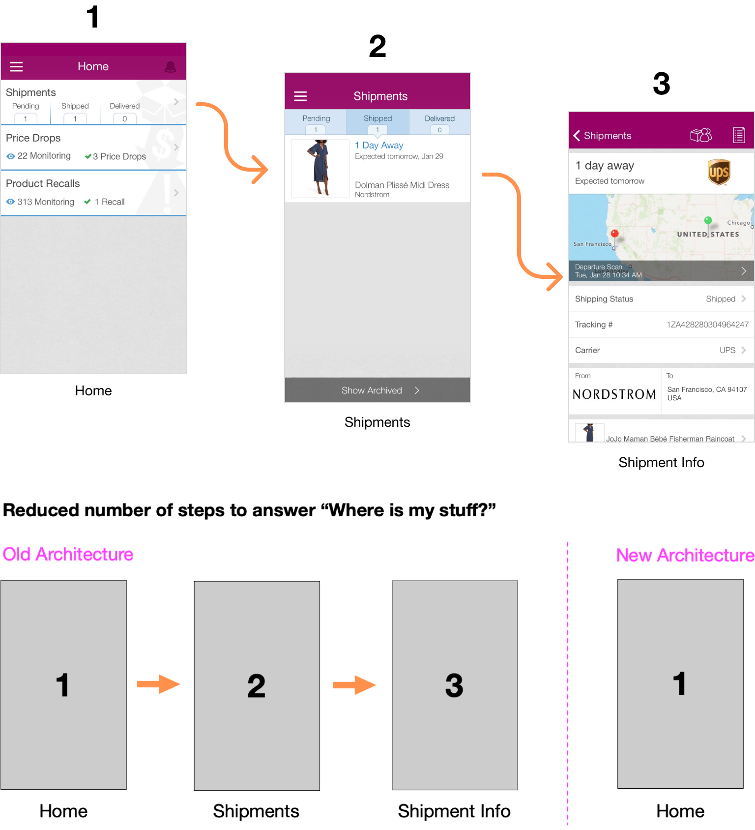 The feed structure also offered flexibility in displaying order details and shipping details within the same card. Users could first see what was coming and then swipe to view where it was or tap to navigate to the shipment detail page.