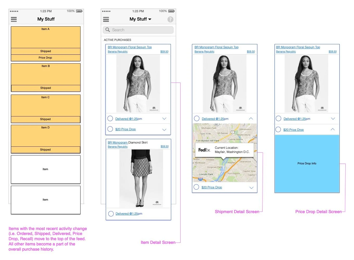 This meant merging content from three different screens within the existing app. It also meant finding a place to display Price Drops and Product Recalls, when they occurred.